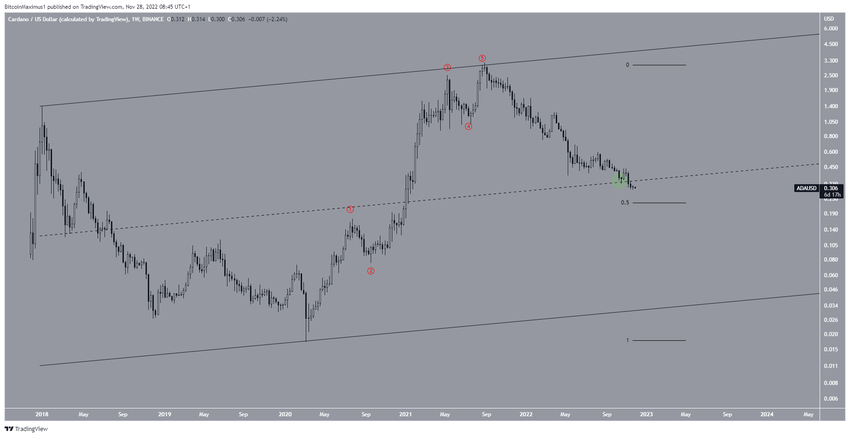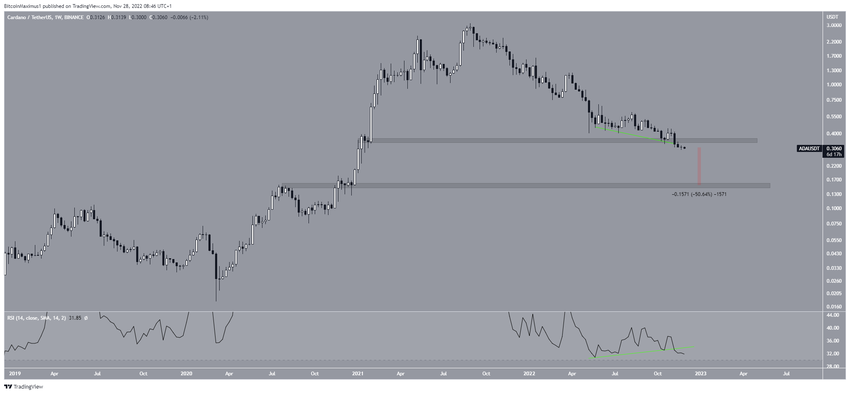 Esto provocó una ruptura del área de soporte horizontal a largo plazo de 0.35 dólares. La caída se aceleró durante noviembre de 2022, una caída vista en todo el mercado cripto.