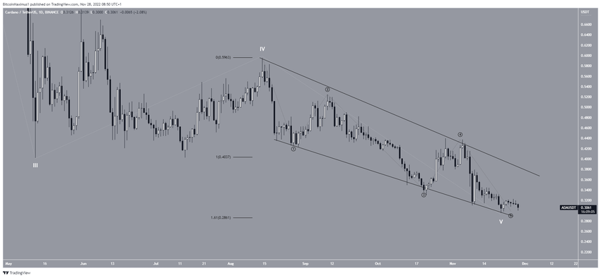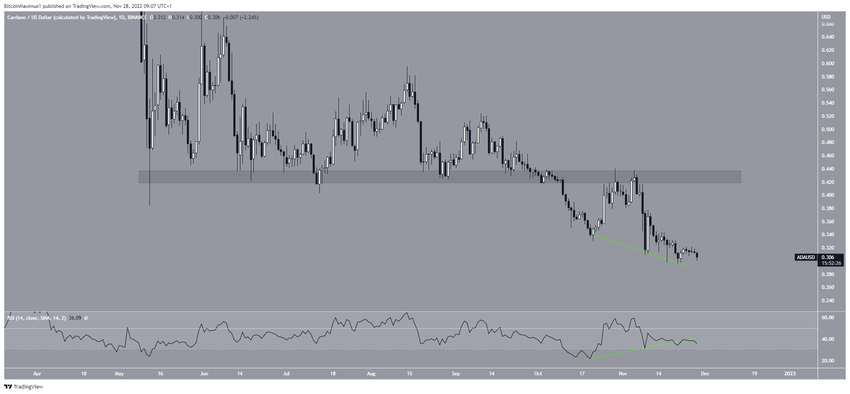 El análisis técnico del gráfico diario muestra que el precio ADA fue rechazado por el área de resistencia horizontal de 0.43 dólares a principios de noviembre. Ha estado cayendo desde entonces. Alcanzó un precio máximo de 0.44 dólares antes del rechazo.
