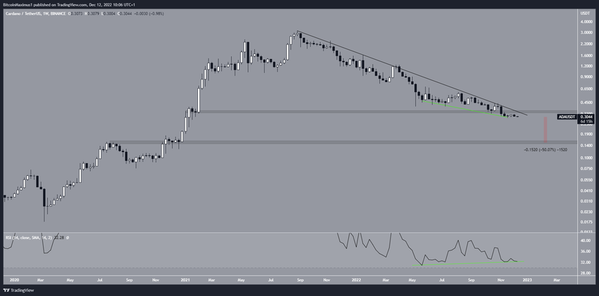 Además de la línea de resistencia descendente, la caída del precio de ADA también provocó una ruptura del área de soporte horizontal de 0.350 dólares. Dado que el nivel ha estado vigente desde 2021, una ruptura por debajo de él es un hecho significativo.