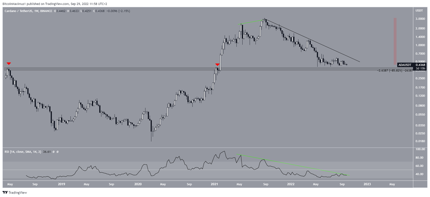 A pesar de esta actualización, el movimiento de precios aún parece bajista. ADA ha caído en un 86% desde que alcanzó un precio máximo histórico de 3.10 dólares en agosto de 2021. El movimiento descendente ha seguido una línea de resistencia descendente.