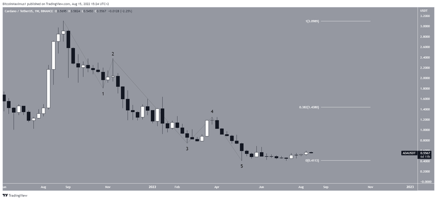 Sin embargo, el recuento a más largo plazo todavía sugiere que el movimiento es correctivo, ya que ADA ha completado un movimiento descendente de cinco ondas (negro) desde el máximo histórico.