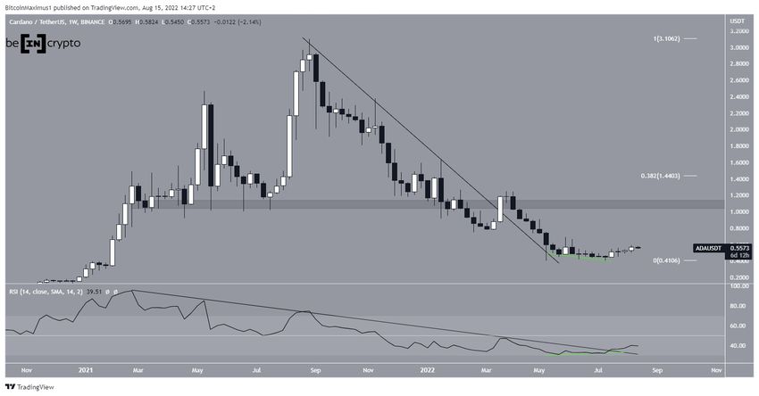 ADA había estado cayendo por debajo de una línea de resistencia descendente desde que alcanzó un precio máximo histórico de 3.10 dólares en agosto de 2021. Este movimiento a la baja llevó a un mínimo de 0.40 dólares en mayo de este año.