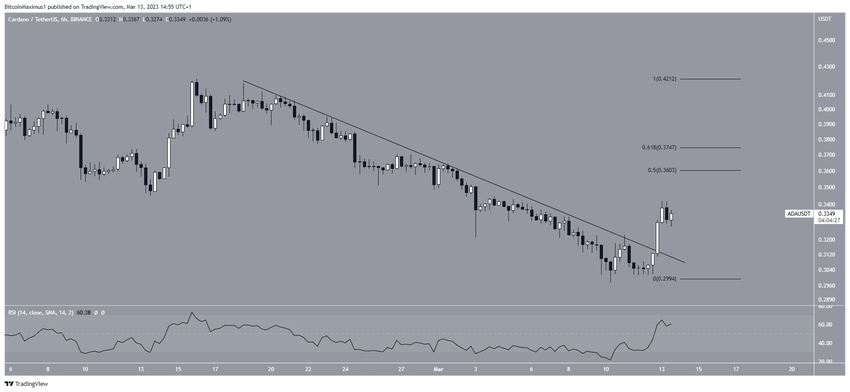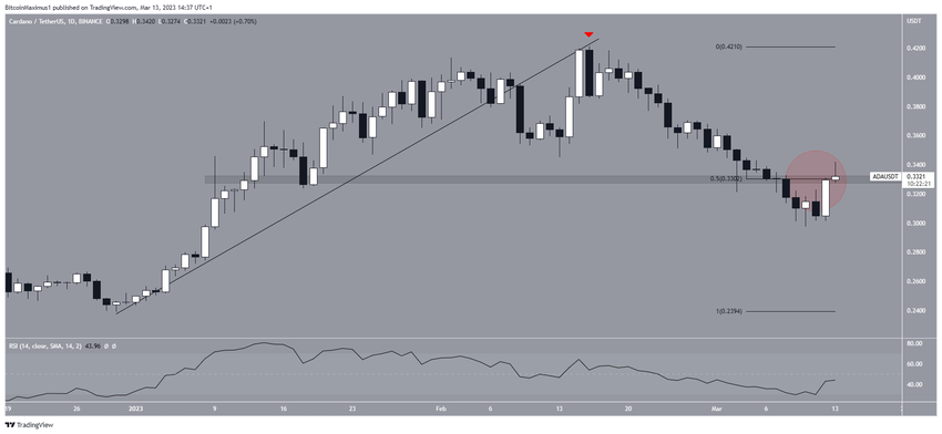 El precio de Cardano ha caído desde el 16 de febrero, cuando validó una línea de soporte ascendente como resistencia (icono rojo). La disminución condujo a un mínimo de 0.298 dólares el 8 de marzo. Si bien el precio de ADA ha aumentado desde entonces, todavía se cotiza dentro del área de resistencia de 0.33 dólares.