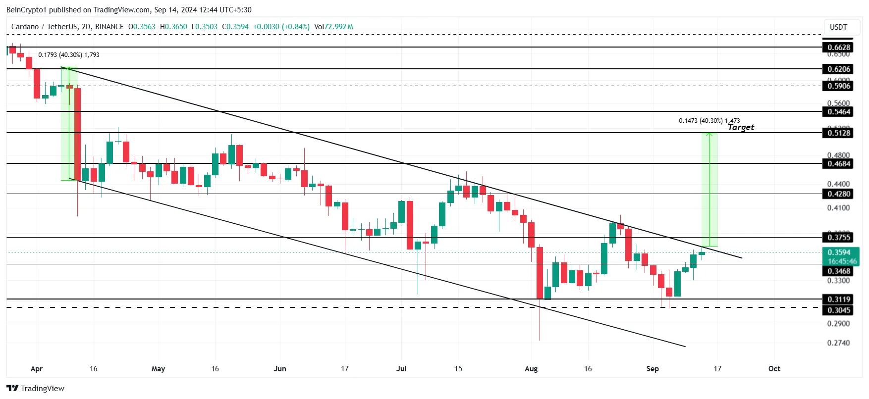 Si ADA logra convertir la barrera de 0,37 dólares en un nivel de soporte, la altcoin podría experimentar un aumento del 40%, en línea con las proyecciones basadas en el patrón actual del gráfico. Tal movimiento posicionaría a ADA en un objetivo de 0,51 dólares, marcando una notable recuperación desde sus mínimos recientes y aumentando la confianza de los inversores.