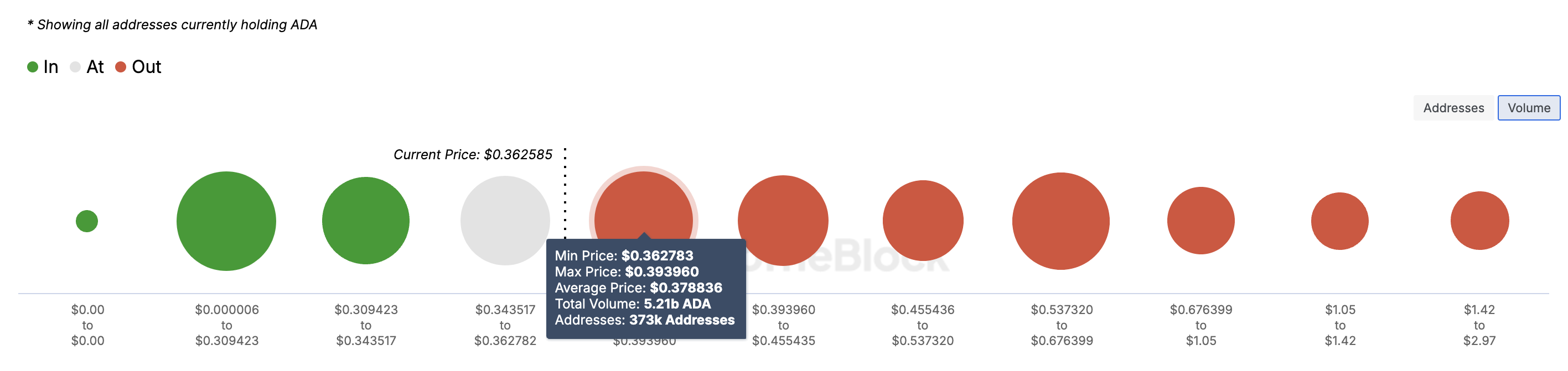 Por lo general, cuanto mayor es el volumen (clusters), más fuerte es el soporte o la resistencia. Como se ve a continuación, 373,000 direcciones que acumularon 5,21 mil millones de ADA a un precio promedio de 0.37 dólares registran pérdidas.