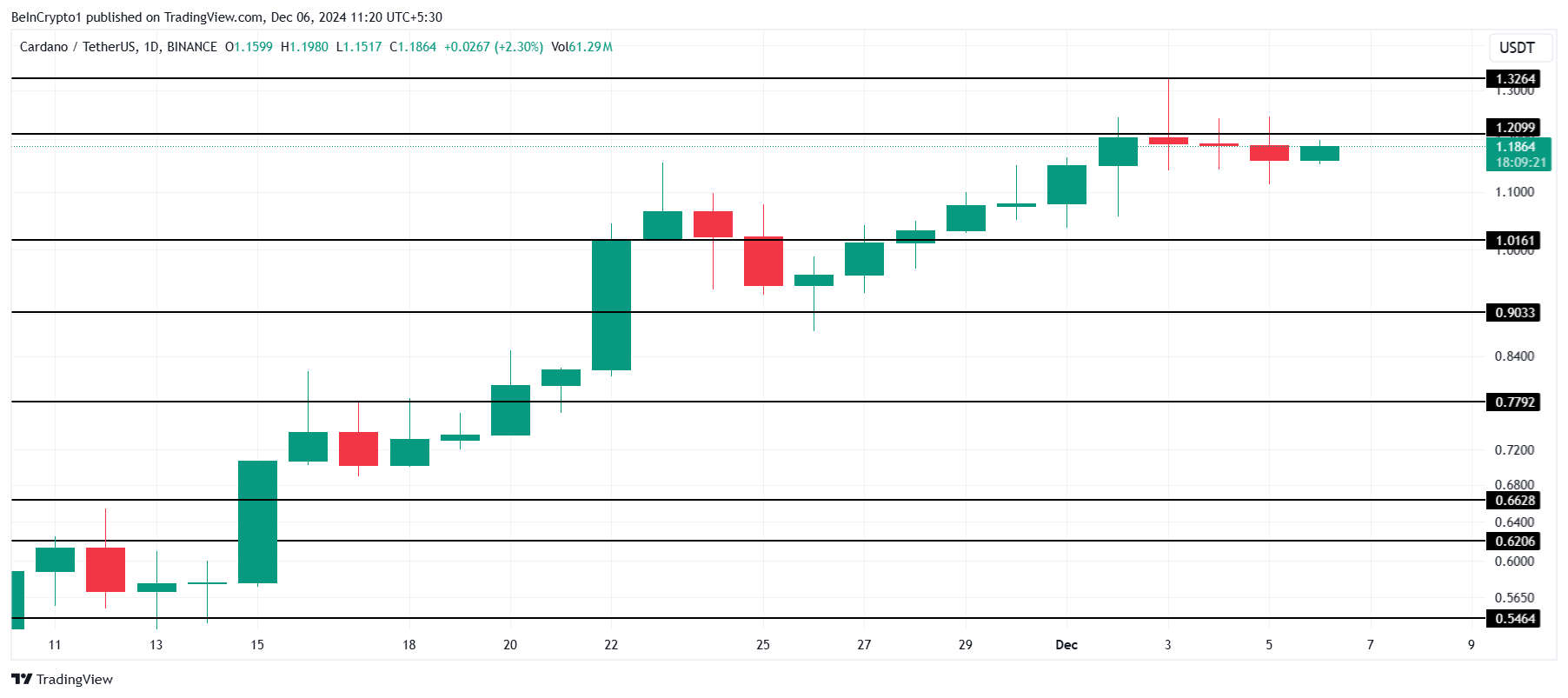 El precio de Cardano está actualmente enfrentando resistencia en la marca de 1.20 dólares, convirtiéndolo en un nivel clave a observar en los próximos días. Si ADA puede romper esta barrera y establecer 1.20 dólares como soporte, la altcoin podría ver más ganancias hacia 1.50 dólares.