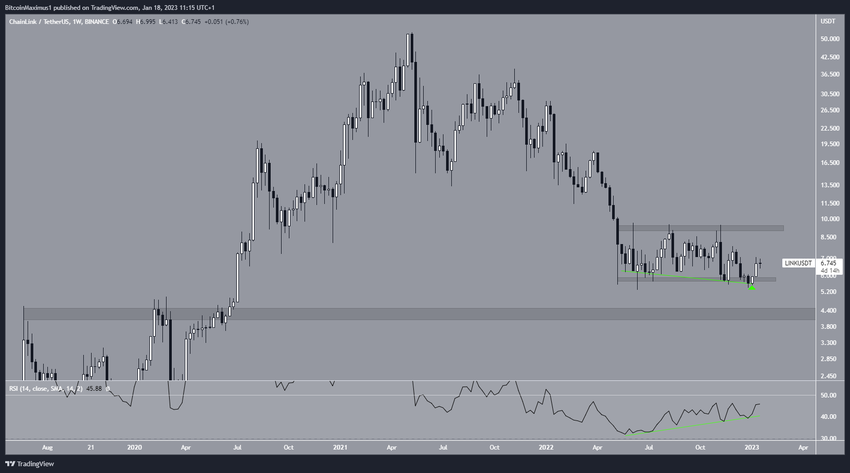 Desde mayo de 2022, el precio de Chainlink se ha negociado dentro de un rango a largo plazo de 5.80 dólares y 9.30 dólares. Tanto la parte superior como la inferior de la gama han sido validadas suficientes veces.