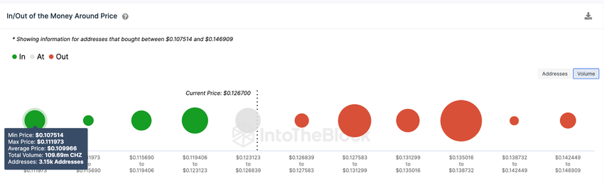 Un análisis crítico de los datos de In/Out of the Money Around Price (IOMAP) compilados por IntoTheBlock sugiere que el precio de Chiliz probablemente caerá a 0.10 dólares.