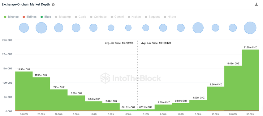 Actualmente, los vendedores han realizado pedidos activos para vender 56 millones de tokens CHZ. Mientras tanto, los compradores solo solicitan 46 millones de CHZ alrededor de los precios actuales.