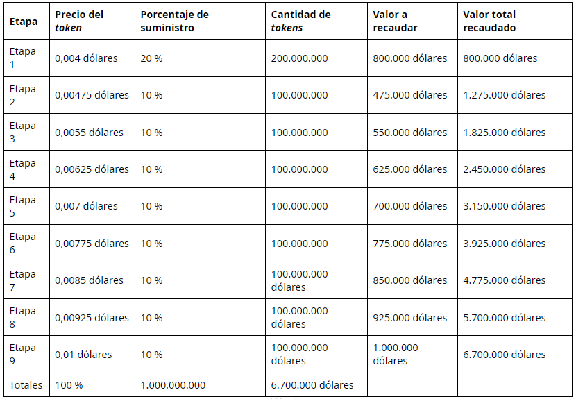 De todas maneras, es bastante posible tener una idea clara de cuál podrá ser el valor de este token a medida que vaya avanzando en sus diferentes etapas de preventa, de hecho, en su whitepaper está totalmente claro.