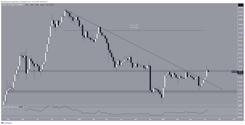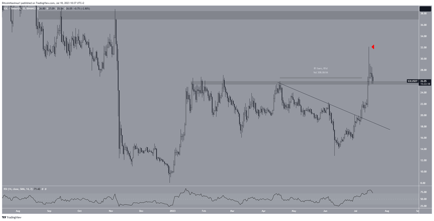 El 14 de julio, SOL alcanzó un nuevo máximo anual de 32.13 dólares. A pesar de que creó una mecha superior larga y cayó después, todavía cotiza por encima del área de 26 dólares.