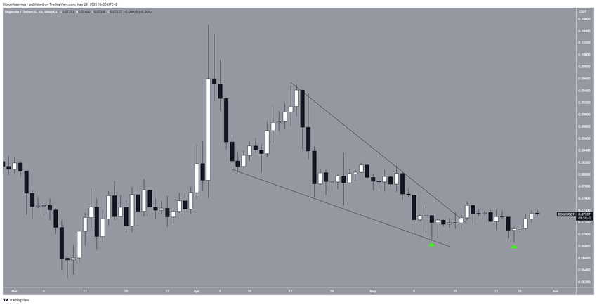 A pesar de este movimiento aparentemente bajista, DOGE creó un patrón de doble fondo combinado con mechas inferiores largas (iconos verdes). De manera similar a la cuña, el doble fondo se considera un patrón alcista.