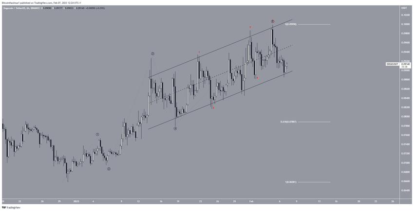 En segundo lugar, el recuento de ondas sugiere que el precio de Dogecoin completó un movimiento ascendente de cinco ondas (negro). En él, la onda cinco tomó la forma de una diagonal final. El recuento de sub-ondas se indica en rojo. Una ruptura del canal confirmaría este recuento bajista. Esto podría ocurrir en las próximas 24 horas.