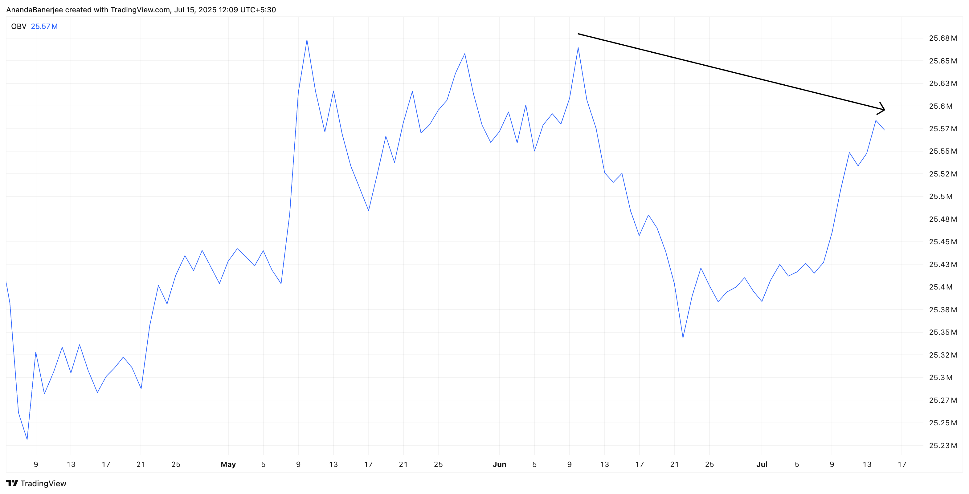 Mientras el precio de Ethereum continuó subiendo del 11 de junio al 14 de julio, el On-Balance Volume (OBV) formó un máximo más bajo, confirmando una divergencia bajista.
