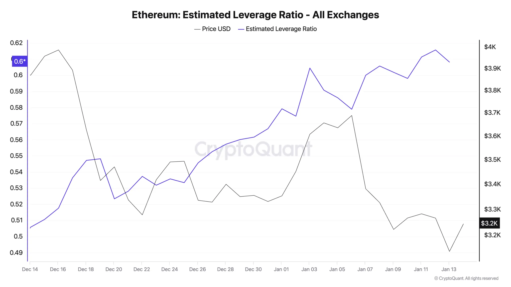 Un indicador de esto es el aumento del Estimated Leverage Ratio (ELR) de ETH. Según CryptoQuant, esta métrica ha mantenido una tendencia al alza a pesar de la caída del precio de ETH en las últimas semanas. Con un valor de 0,60 al momento de la publicación, el Estimated Leverage Ratio (ELR) de ETH ha aumentado 20% en el último mes, a pesar de una caída del 15% en su precio durante el mismo período.