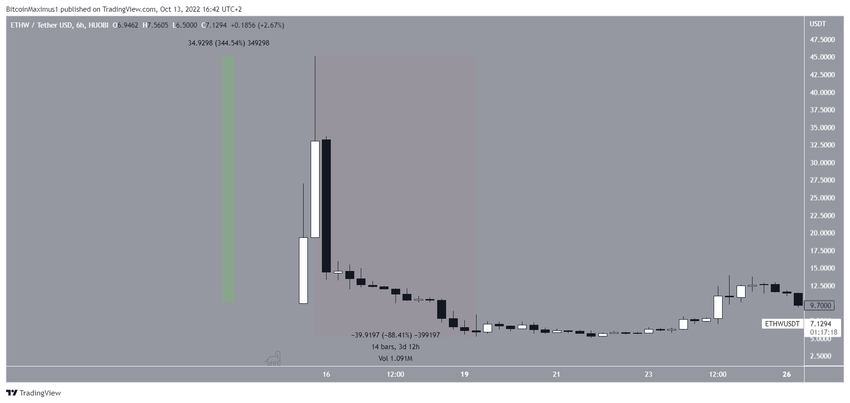 En un lapso de tres días y medio, ETHW cayó un 88.40%, culminando con un mínimo de 5.30 dólares el 19 de septiembre. Curiosamente, esto fue considerablemente inferior al precio de cotización de 10 dólares.