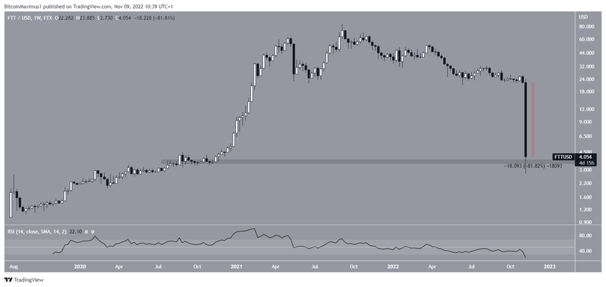 El precio de FTT inició un importante movimiento a la baja el 8 de noviembre. Cayó a un mínimo de 2.73 dólares al día siguiente. El mínimo se realizó por debajo del área de soporte horizontal de 3.65 dólares , que había estado vigente desde agosto de 2020. Como resultado, estuvo por debajo del mínimo de 2021.