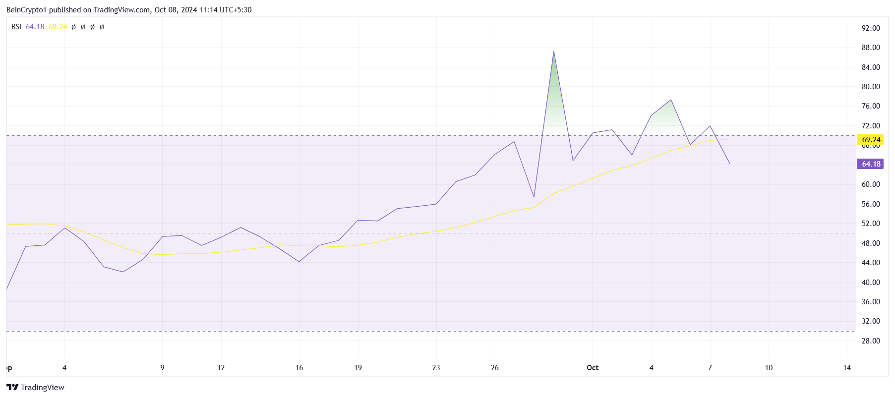 El RSI, que anteriormente había alcanzado la zona de sobrecompra, ahora está retrocediendo, indicando que la fase alcista podría estar llegando a su fin. Este cambio podría marcar el comienzo de una tendencia bajista, especialmente a medida que más inversores buscan asegurar sus ganancias.