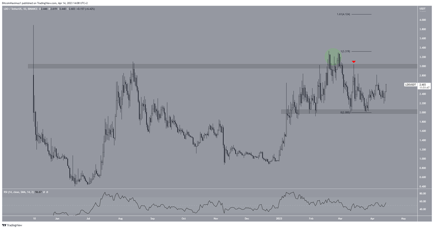 En febrero de 2023, el precio LDO creó un patrón de doble techo (círculo verde) por encima del área de resistencia horizontal de 3 dólares. El doble techo se considera un patrón bajista, lo que significa que conduce a reversiones la mayor parte del tiempo.