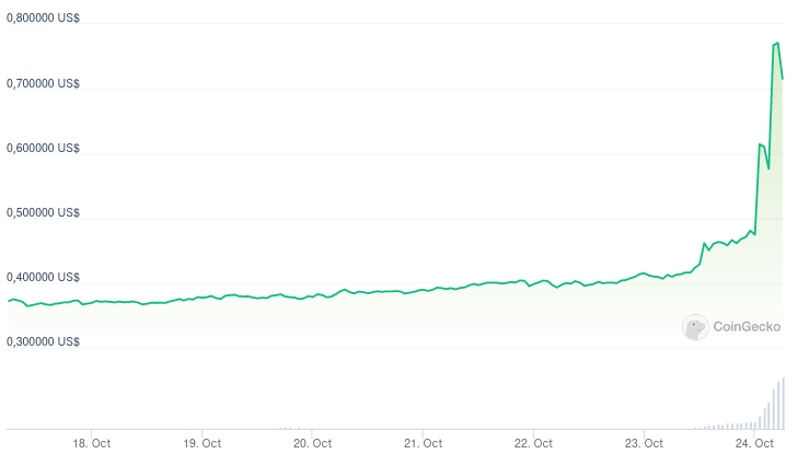 En el momento de escribir este artículo, MINA cotiza a 0.768 dólares, según CoinGecko. Esto es un 114% más alto que el nivel mínimo que registró la criptomoneda el 11 de octubre de este año.