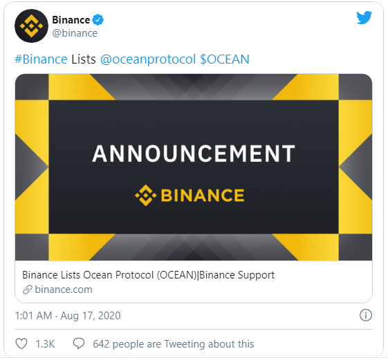 Binance listará a Ocean Protocol (OCEAN) y abrirá el trading para los pares comerciales OCEAN/BTC, OCEAN/BNB y OCEAN/BUSD el 17/08/2020 a las 8:00 a.m. UTC.