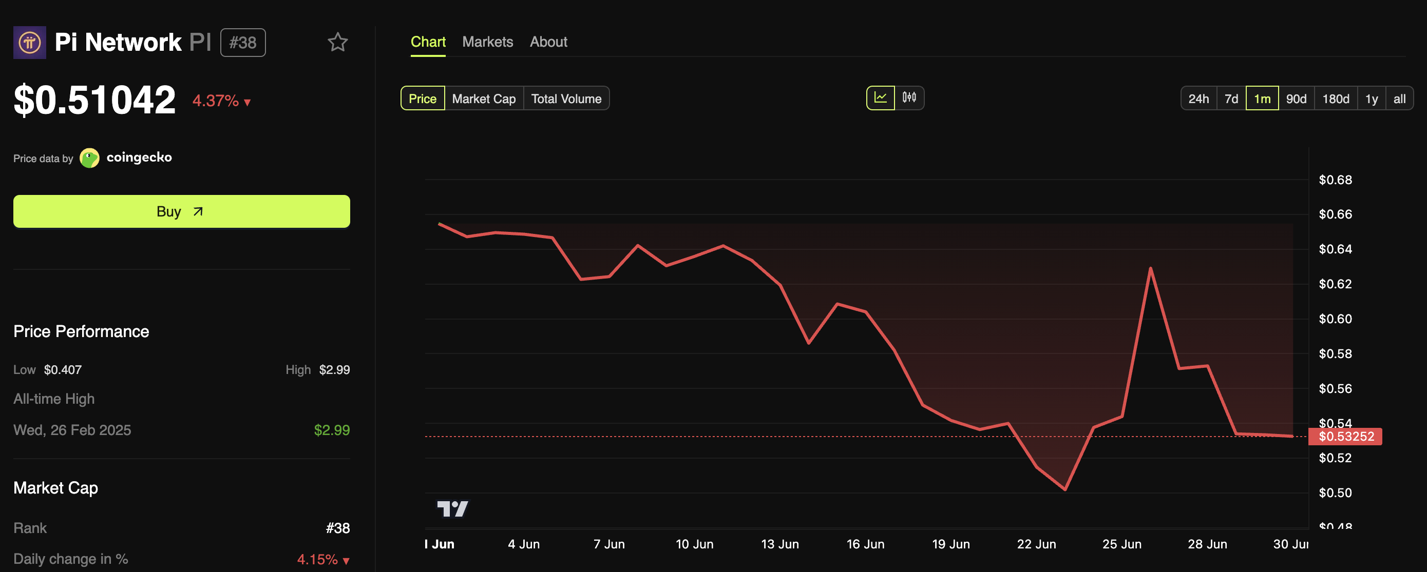 Los datos de BeInCrypto mostraron que el precio de PI ha caído un 4.3% en las últimas 24 horas. Al momento de escribir, la altcoin se negociaba a 0.51 dólares. El volumen de trading también ha disminuido un 4.9% a solo 96 millones de dólares. Esto refleja un interés reducido de los traders.