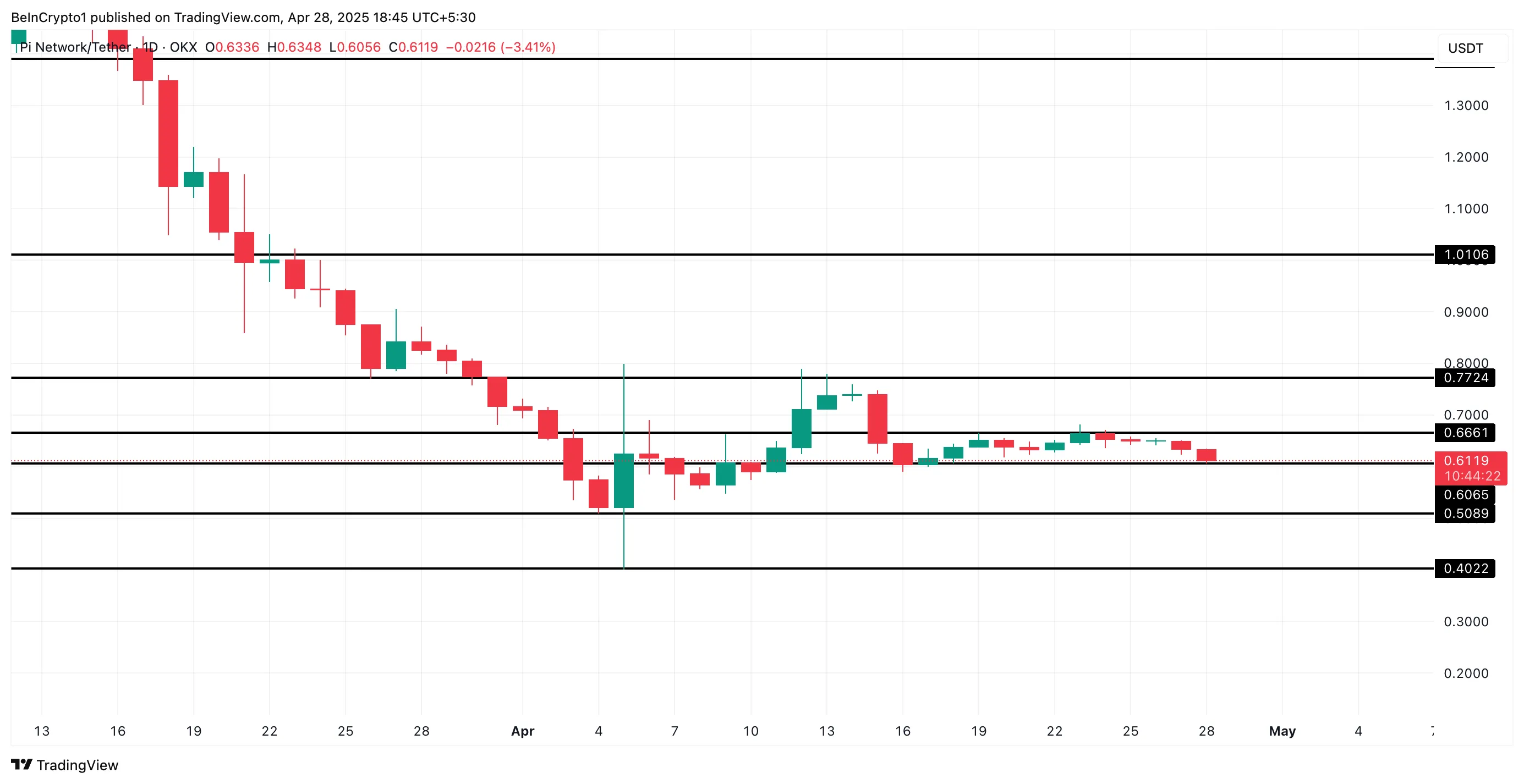 El token PI de Pi Network parece haber entrado en una fase de consolidación, ya que la acción del precio se ha estabilizado. Desde el 16 de abril, el token ha enfrentado resistencia a 0,66 dólares mientras encuentra soporte a 0,60 dólares, creando un rango de trading estrecho.