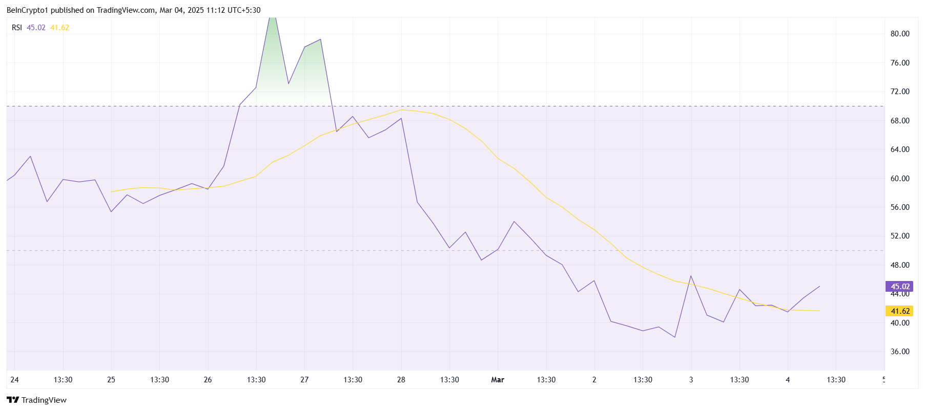 A pesar de las señales de recuperación, el Índice de Fuerza Relativa (RSI) permanece por debajo de la marca neutral de 50.0, indicando un sentimiento bajista persistente.