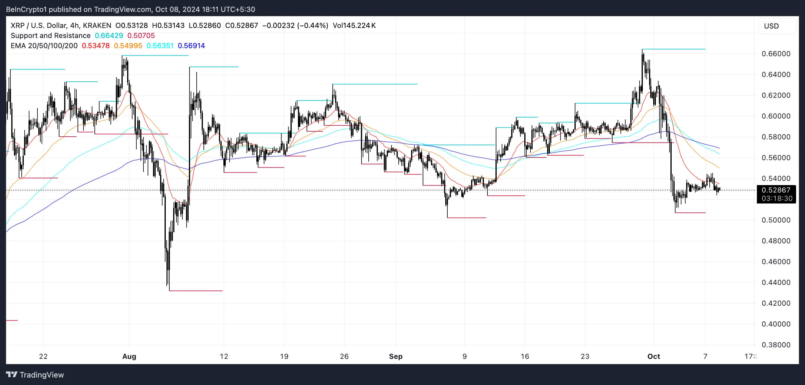 Si XRP continúa siguiendo esta tendencia negativa, el precio podría caer aún más. Podría potencialmente alcanzar 0,43 dólares, lo que representaría una disminución del 17% desde los niveles actuales. Sin embargo, si el precio de XRP logra revertir el impulso bajista, podría volver a probar la resistencia en 0,61 dólares.