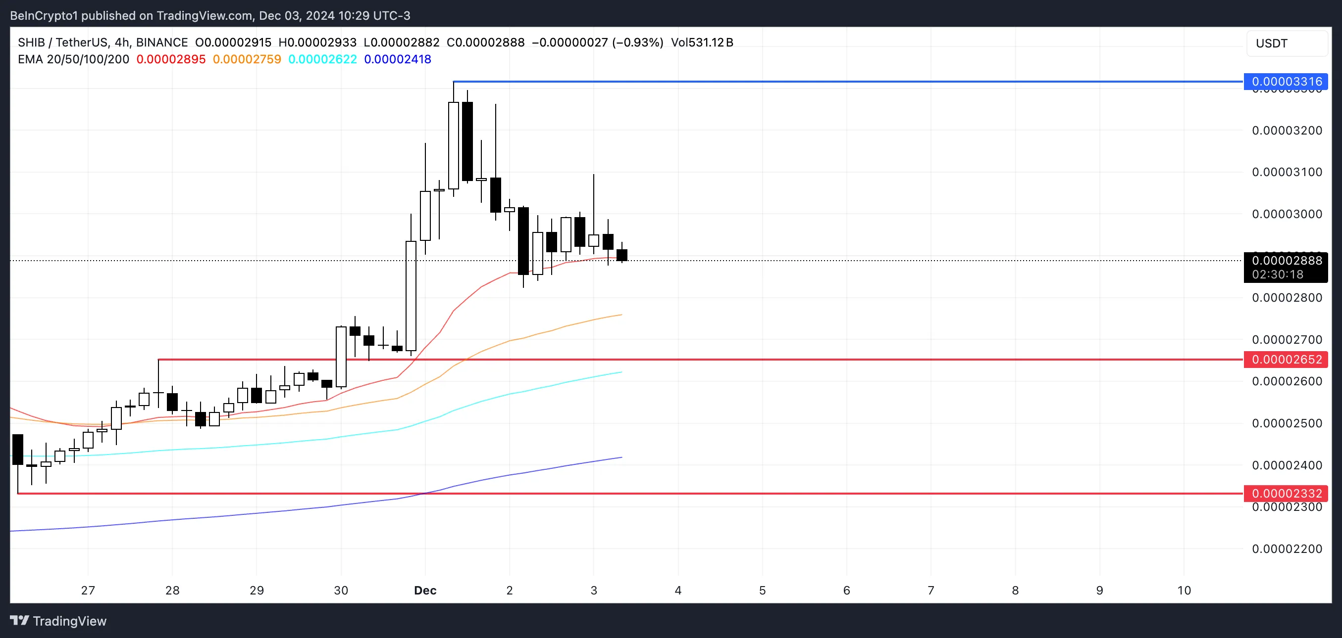 El precio se encuentra ahora en una encrucijada crítica con posibles oscilaciones de precio significativas en cualquier dirección. Un escenario bajista podría llevar el precio de SHIB a probar los niveles de soporte de 0,000026 dólares y 0,000023 dólares, representando una caída del 17,8%.