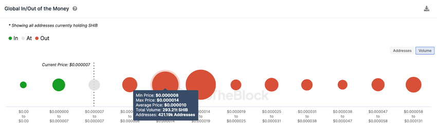 Los datos Global In/Out of Money Around Price (GIOM), que muestran la distribución del precio de compra de los actuales holders de Shiba Inu, también dan crédito a esta predicción.