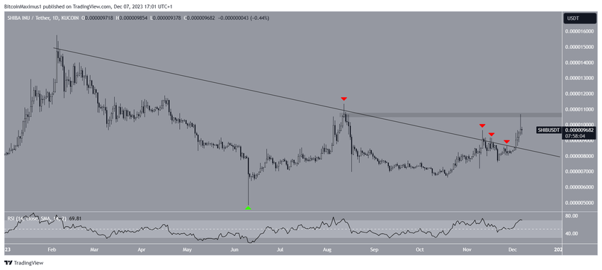 El análisis técnico del marco de tiempo diario muestra que el precio de Shiba Inu había caído por debajo de una línea de tendencia de resistencia descendente desde enero.