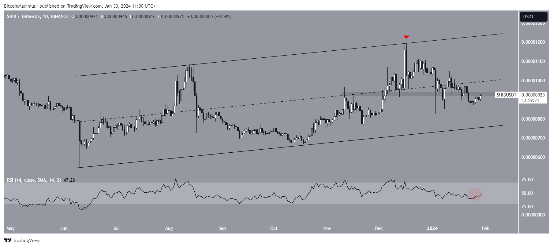 El análisis técnico del marco de tiempo diario muestra que el precio de SHIB ha negociado dentro de un canal paralelo ascendente desde junio de 2023.