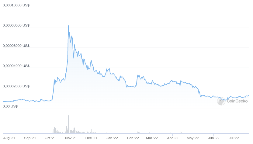 Al momento de la publicación, y en pleno bear market, la popular criptomoneda meme cotiza en 0.00001235 dólares, un 85% por debajo de su máximo histórico, según los datos de CoinGecko.
