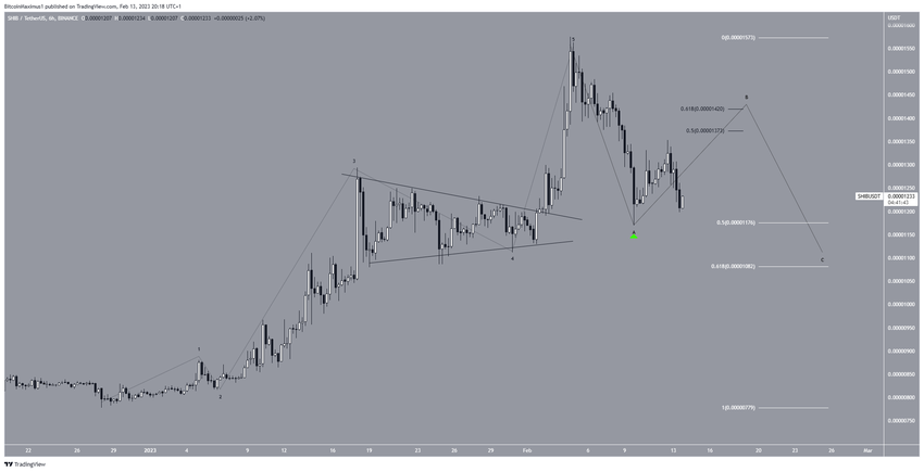El análisis técnico a corto plazo de seis horas muestra que el precio del token Shiba Inu completó un movimiento ascendente de cinco ondas que condujo al máximo de 0.0000157 dólares. El triángulo que formaba parte de la onda cuatro es la característica distintiva de este movimiento, al igual que la fuerte disminución posterior.