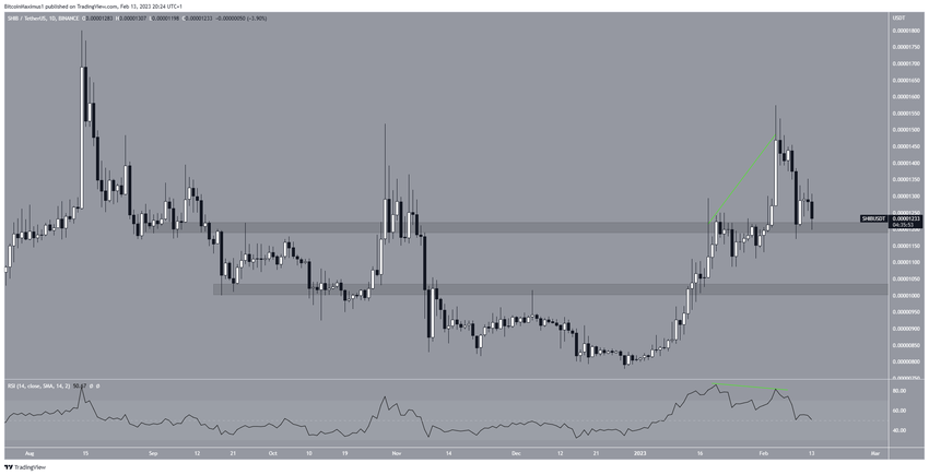 El precio de SHIB ha caído desde el 4 de febrero, cuando alcanzó un máximo de 0.0000157 dólares. La disminución estuvo precedida por una divergencia bajista en el RSI diario (línea verde).