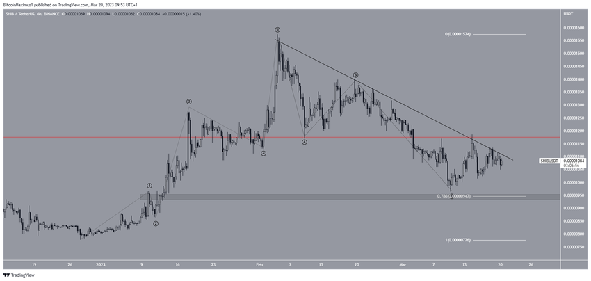 El análisis técnico del marco de tiempo de seis horas indica que el precio SHIB puede haber completado una corrección A-B-C después de un movimiento alcista de cinco ondas.