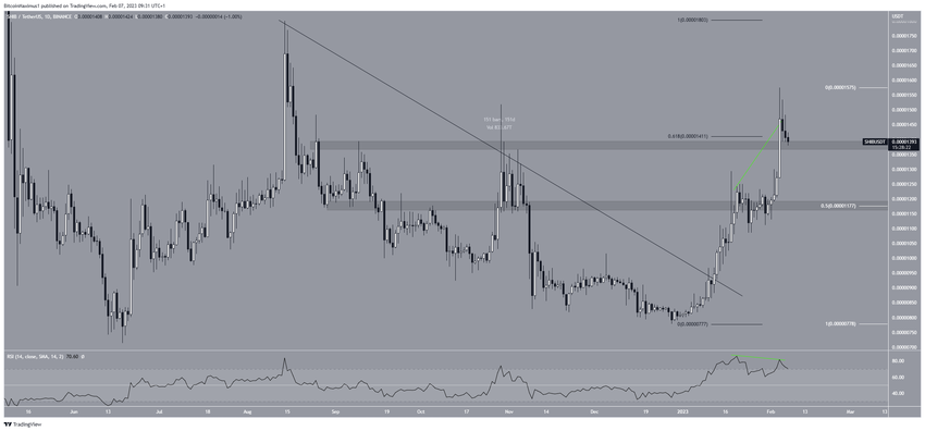 El precio SHIB rompió una línea de resistencia descendente de 151 días el 13 de enero. El precio ha aumentado considerablemente desde entonces, alcanzando un máximo de 0.0000157 dólares el 4 de febrero.
