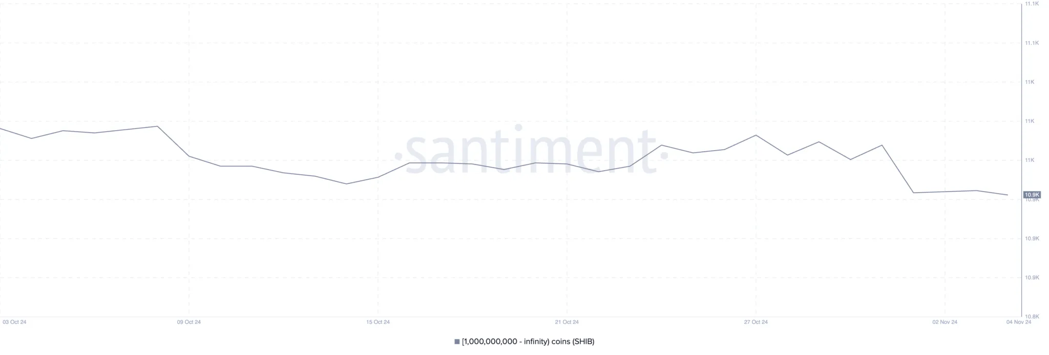 Entre el 31 de octubre y el 1 de noviembre, el número de holders de SHIB con al menos mil millones de tokens bajó de 11,024 a 10,981. Seguir estas grandes carteras, o “ballenas”, es esencial porque poseen porciones significativas del suministro y tienen el potencial de impactar los movimientos de precios.