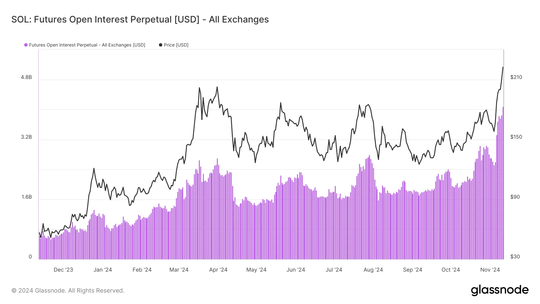 Este aumento lo ha acercado a su máximo histórico, y ahora necesita un aumento del 15% para volver a probar la región. Pero eso no es todo. Según Glassnode, el Interés Abierto de SOL ha alcanzado un récord de 4 mil millones de dólares. El OI, como comúnmente se llama a la métrica, es la suma del valor de todos los contratos abiertos en el mercado.