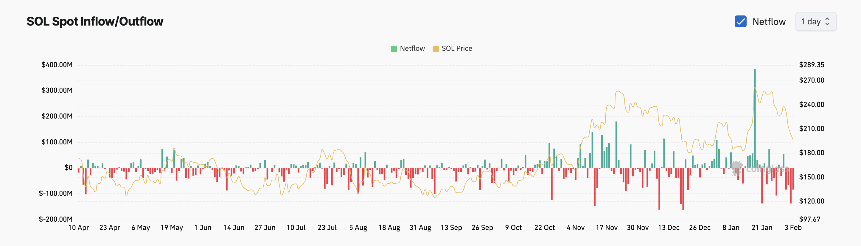 Esto se refleja en las salidas constantes de los mercados spot de SOL en los últimos tres días, que han totalizado 367 millones de dólares según Coinglass.