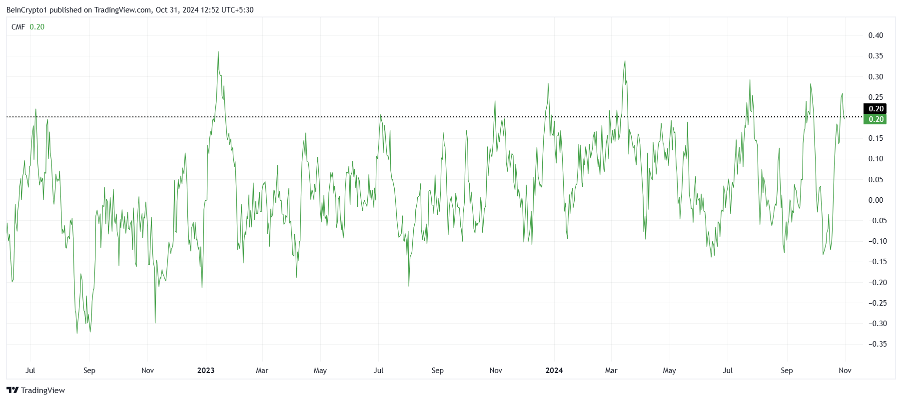 El sentimiento de mercado actual de Solana refleja precaución, ya que el indicador Chaikin Money Flow (CMF) muestra a SOL por encima del nivel 20.0, un punto donde los flujos de entrada típicamente han alcanzado su máximo.