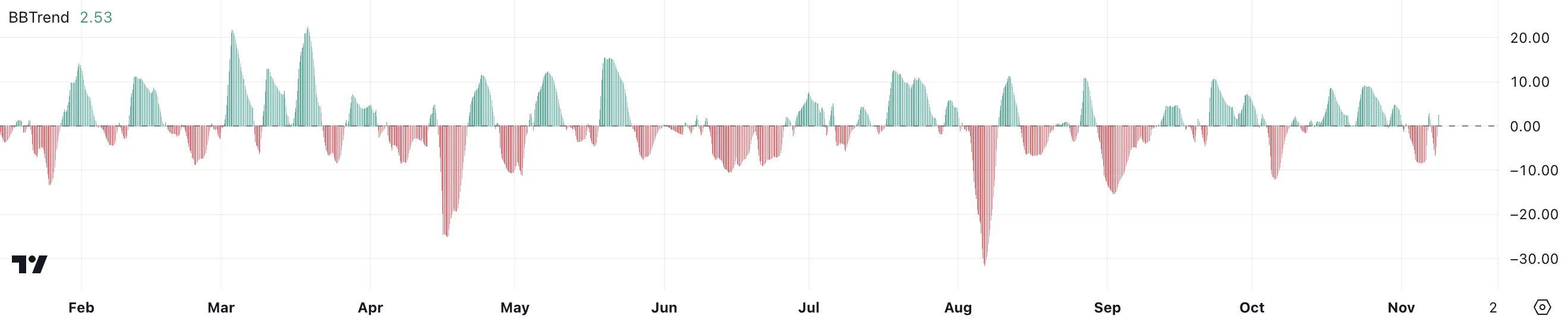 El indicador BBTrend para SOL está actualmente en 2,53. Hace apenas unos días, cayó cerca de -10, indicando una extrema presión bajista, antes de recuperarse ligeramente. Esta recuperación sugiere que algo de interés de compra ha regresado. BBTrend, o Tendencia de Bandas de Bollinger, mide el impulso en relación con las Bandas de Bollinger.