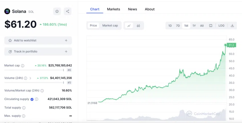 El precio de Solana ha experimentado un aumento impresionante en los últimos días. Según datos recopilados en CoinMarketCap, el precio de SOL muestra un crecimiento del 186.60% mensual, pasando de 21.31 dólares a 61.2 dólares.