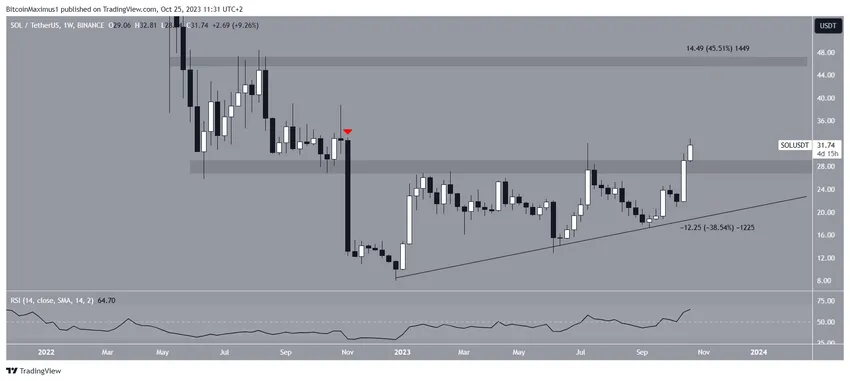 El gráfico de tiempo semanal de Solana es decididamente alcista. Muestra que el precio finalmente cerró por encima del área de resistencia horizontal de 28 dólares. Este es el cierre más alto desde antes del colapso de FTX (icono rojo). El cierre llevó al precio máximo anual de Solana de 32.81 dólares.