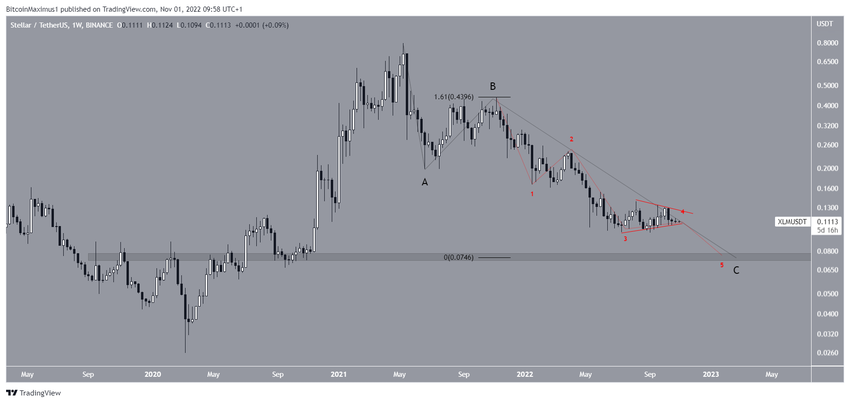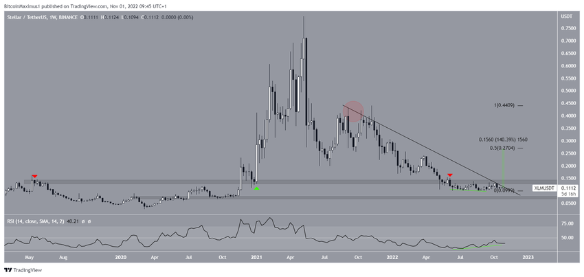 El precio de XLM ha caído desde que alcanzó un máximo histórico de 0.798 dólares en mayo de 2021. Desde septiembre del mismo año (círculo rojo), ha caído por debajo de una línea de resistencia descendente. El movimiento a la baja ha llevado a un mínimo de 0.098 dólares en septiembre de 2022.