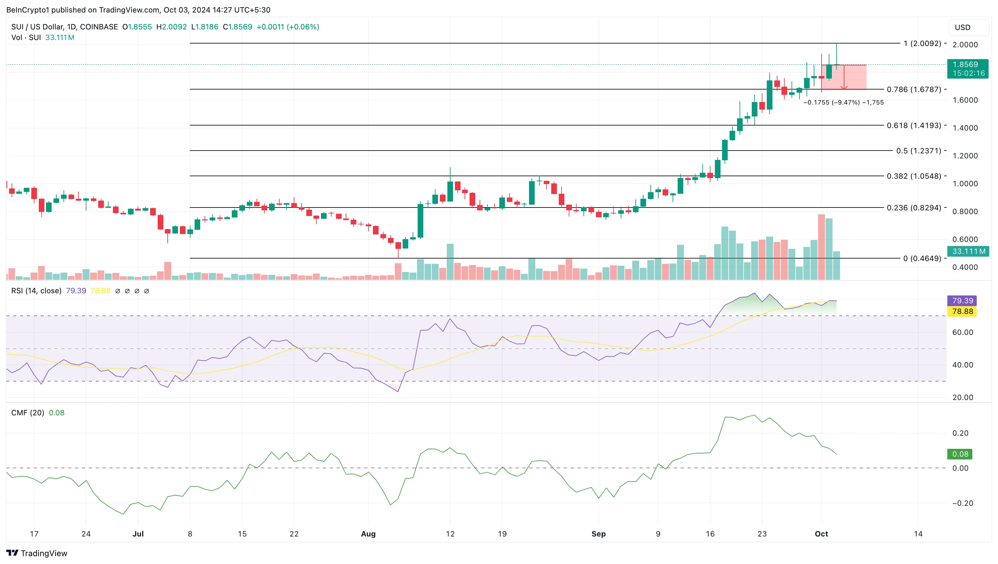 Por otro lado, una lectura por debajo de 30,00 significa que está sobrevendido. Con el precio de SUI a 1,85 dólares, el RSI es 78,69, reforzando la condición mencionada anteriormente. El Chaikin Money Flow (CMF) es otro indicador técnico que predice una disminución del precio. Normalmente, el CMF mide el nivel de acumulación y distribución.