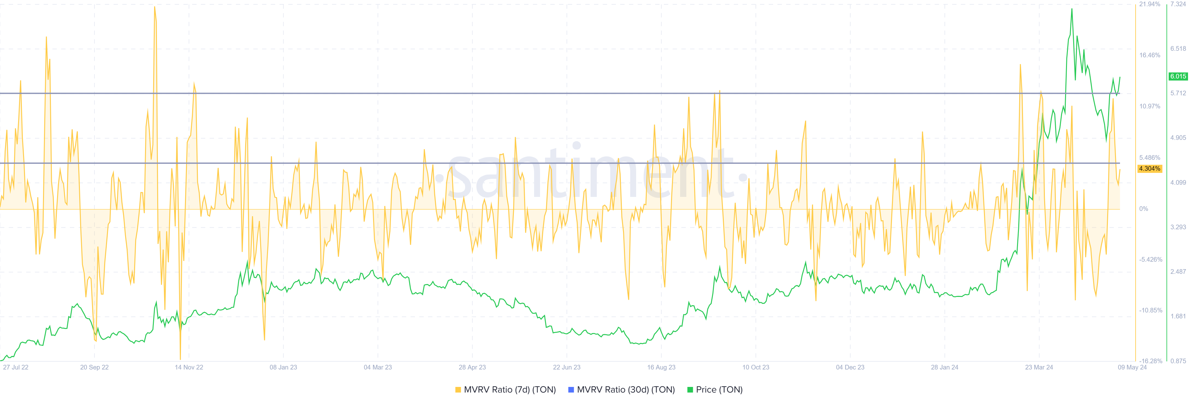 El MVRV de 7 días de Toncoin se sitúa en 5.2%, lo que indica ganancias y podría provocar ventas. Históricamente, las correcciones de TON ocurren dentro del rango MVRV de 4% a 12%, etiquetándolo como una zona de peligro.