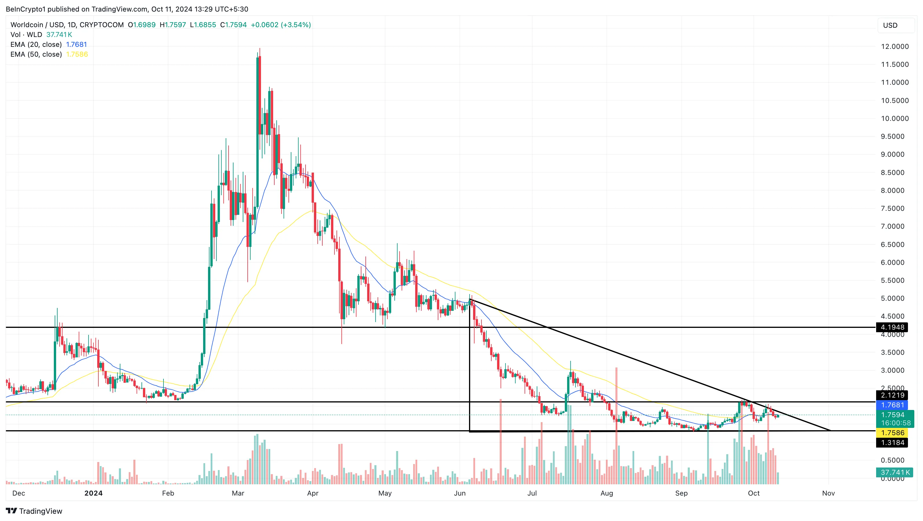El 7 de octubre, el precio de Worldcoin alcanzó los 2,05 dólares, y muchos inversores esperaban que este acontecimiento fuera el inicio de una carrera hacia el máximo que alcanzó a principios de año. Pero no fue así, ya que WLD se negocia ahora a 1,75 dólares.