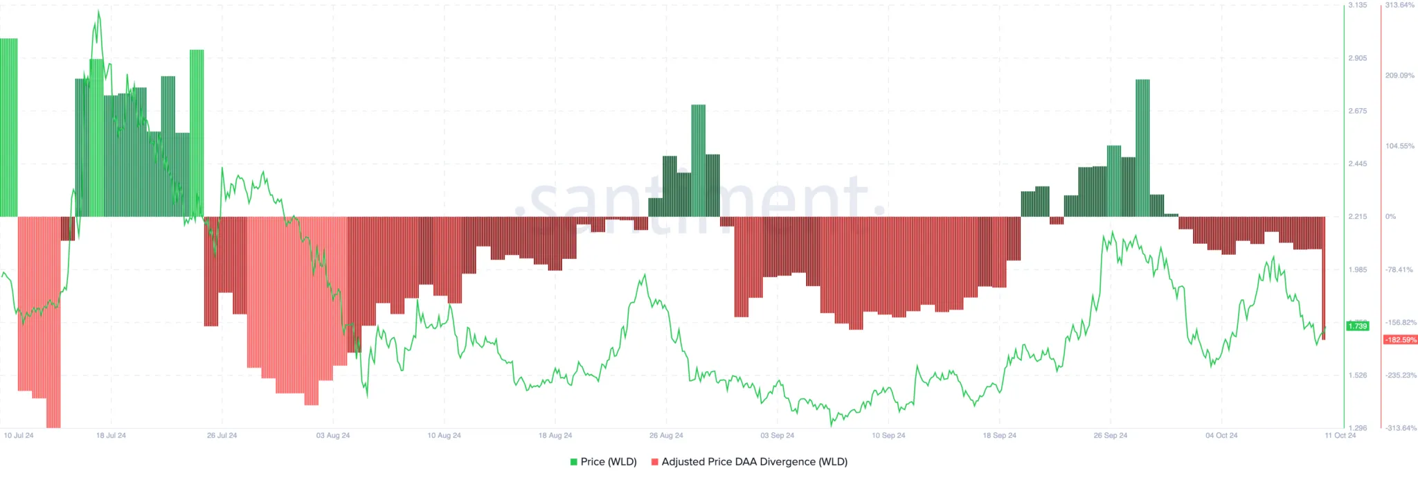 Los hallazgos de BeInCrypto revelan que la venta masiva por parte de inversores minoristas e institucionales es una de las razones por las que WLD no pudo mantener la marca de los 2 dólares. Además, los datos de Santiment sugieren que WLD puede tener dificultades para recuperarse en un futuro próximo debido a la divergencia desfavorable precio-DAA.